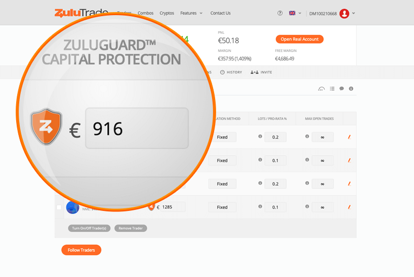 The ZuluGuard™ automatically calculates a trading exit value for the trades opened in your account based on your specified capital protection amount. When your threshold is hit, ZuluGuard™ will step in, it will close all open positions and disable the Trader instantly.